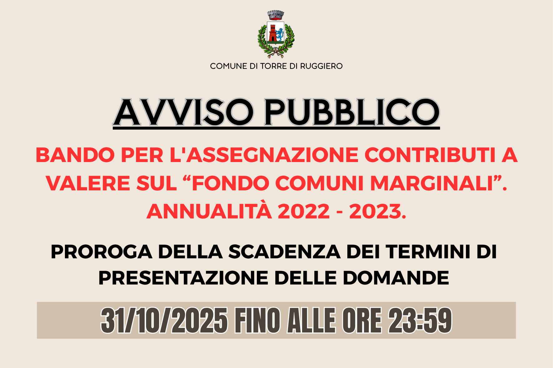 BANDO PER L'ASSEGNAZIONE CONTRIBUTI A VALERE SUL “FONDO COMUNI MARGINALI”. ANNUALITÀ 2022 - 2023. PROROGA SCADENZA TERMINI AL 31/10/2025 ore 23:59